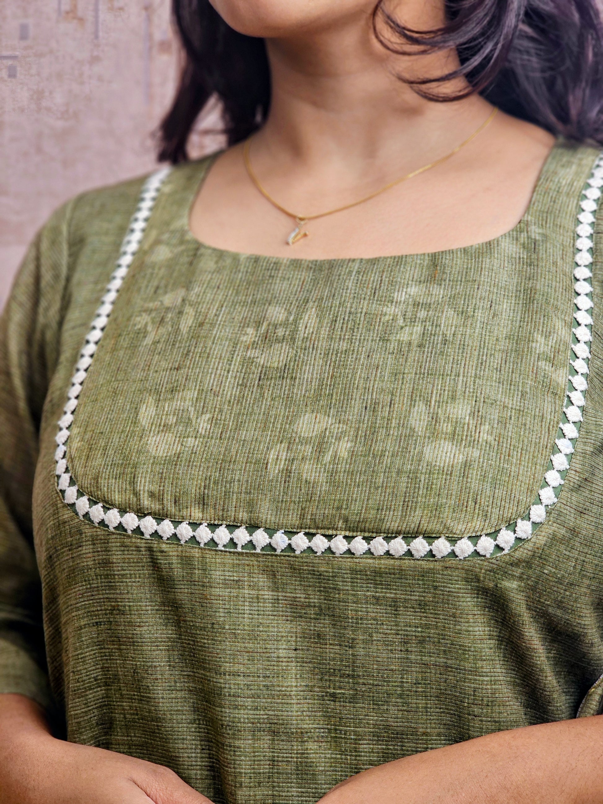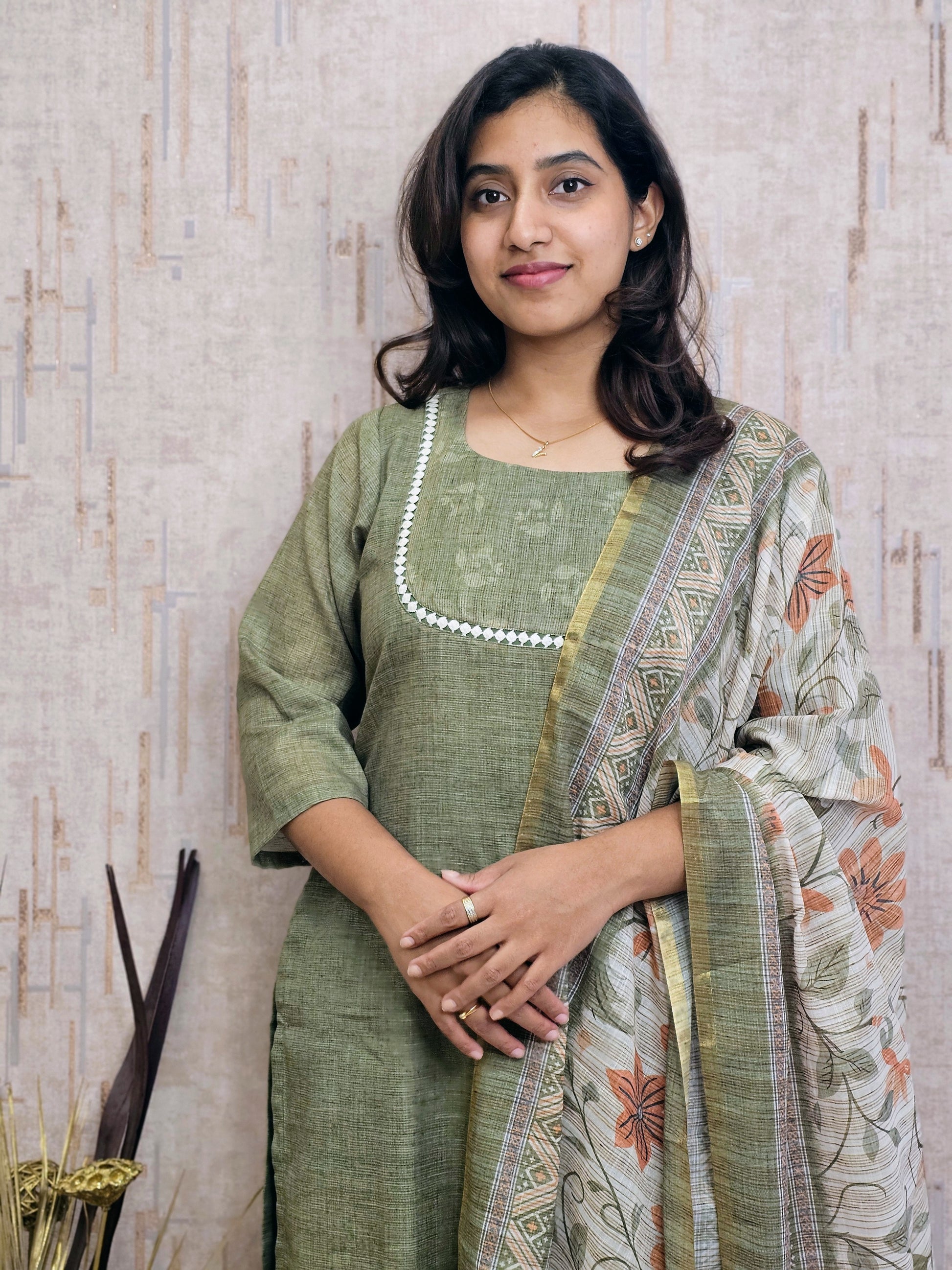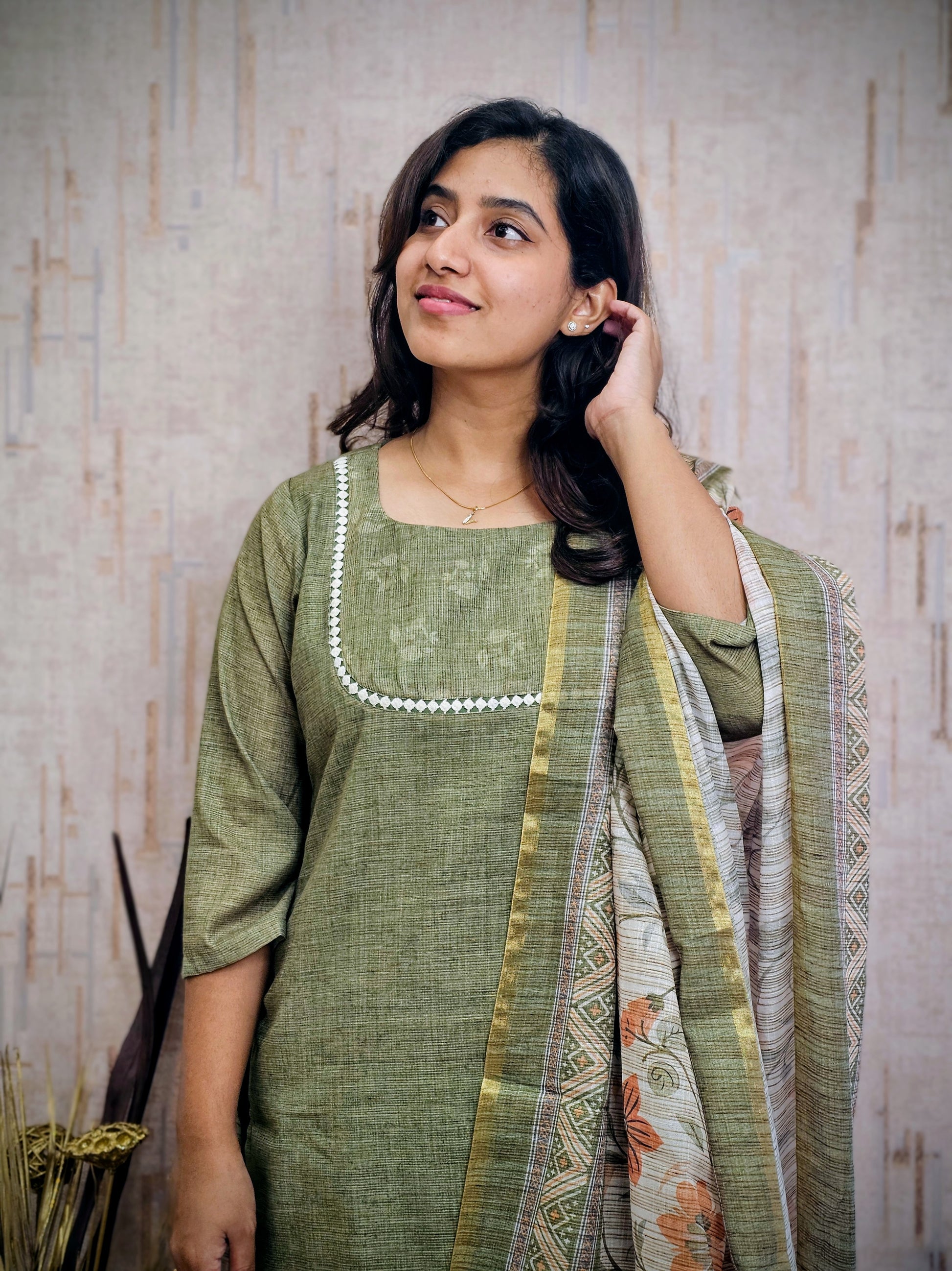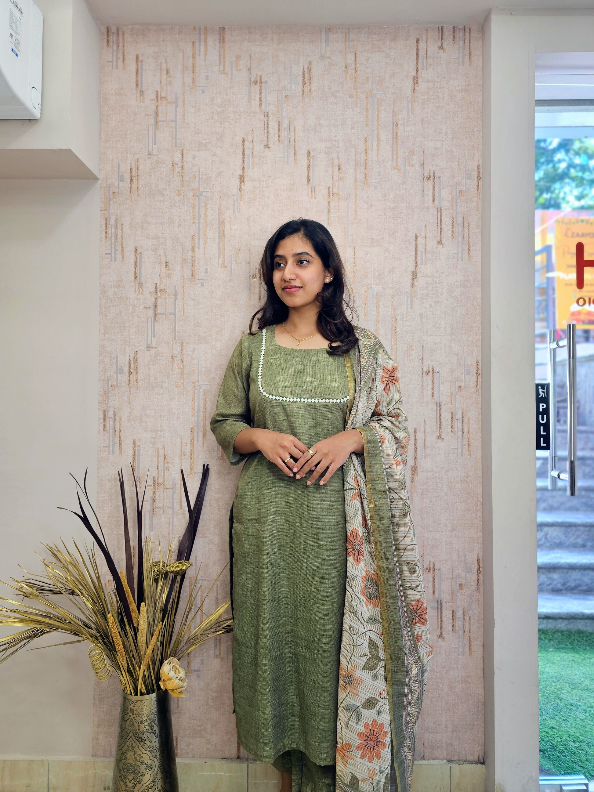 Meet your new office essential! This cotton kurta set features delicate lace accents and a striking contrast dupatta that pulls the whole vibe together. Comfortable, chic, and ready for anything your workday throws at you.